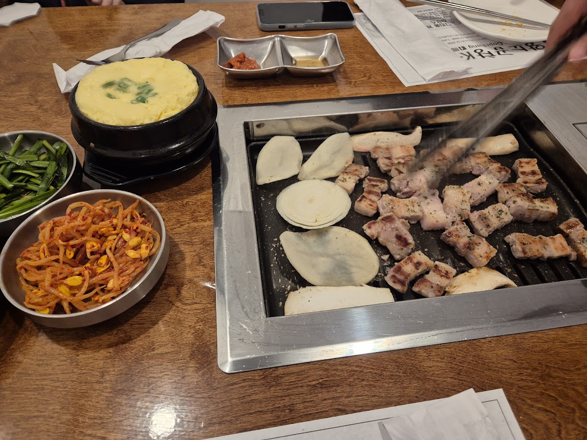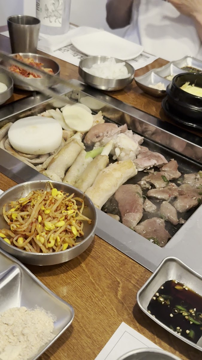 I came here with some friends and it was so delicious! We had the Stone Pot Bibimbap, Spicy seafood soup,potato pancakes, and the A Set. The customer service was amazing and they grilled the cow innards for us and it came with delicious dipping sauces! So so so good!!! My first time trying cow intestines so I was a bit intimidated but our server was great, she explained all the different parts to us, suggested which sauces to dip. I'm DEFINITELY going back here to have cow intestines again haha. They also had lots of different korean beers and alcohol so I wanna come back to drink Great music, atmosphere, AND a cool feature is they have bells on each table to press if we want to call our server and it makes a MOOOO sound like a cowLove that small detail though hahah. Favorite korean restaurant in Savannah!!!!!